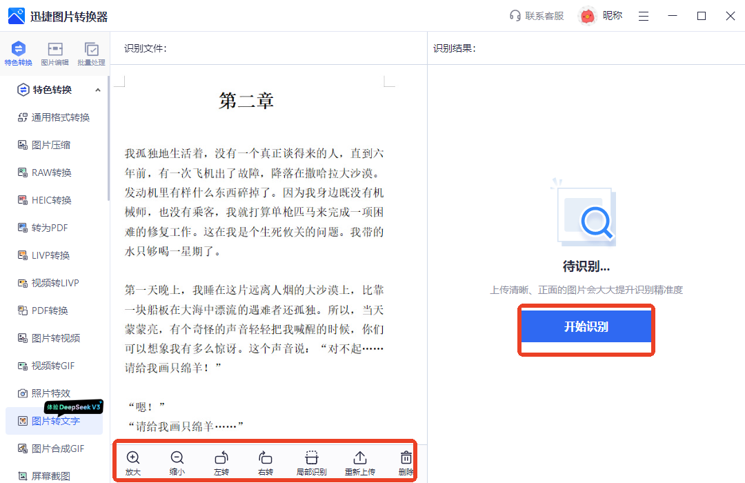 打开后先找到并选中【图片转文字】,随后添加单张目标图片,支持放大、缩小、左转、右转、局部识别等多种处理,确认无误后点击右侧的“开始识别”按钮。