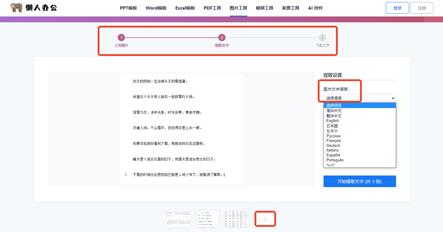 操作仅需3步,先上传单或多张图片文件,再按需选择图片文字语言,有预设多种,确定好后按下“开始提取文字”,处理过程在云端进行,还会保障隐私安全。