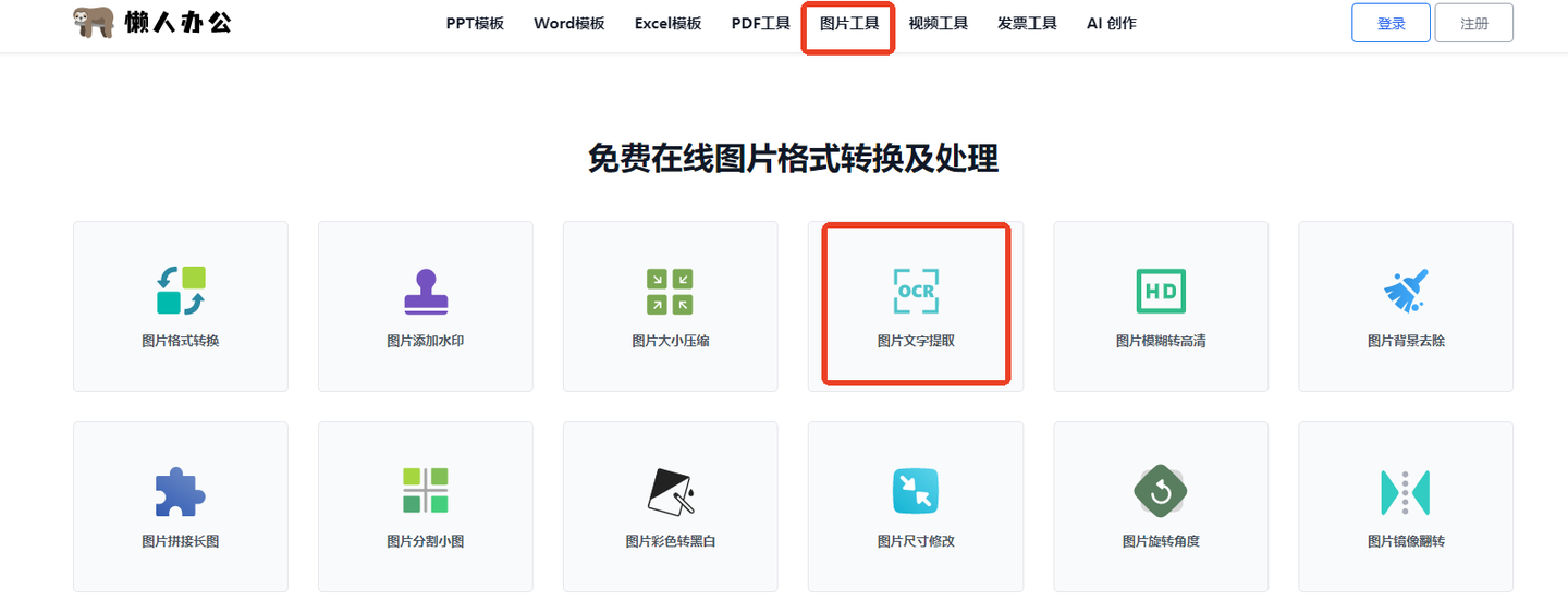 一个提供PPT/Word/Excel模板下载及PDF/视频/发票等工具的在线平台,这里用到的是【图片文字提取】,打开后点击界面顶部的“图片工具”便能找到了。