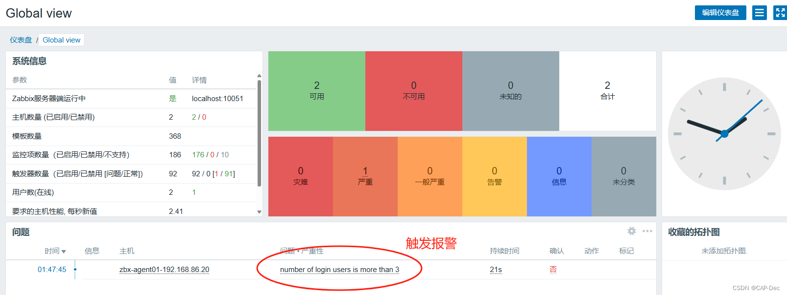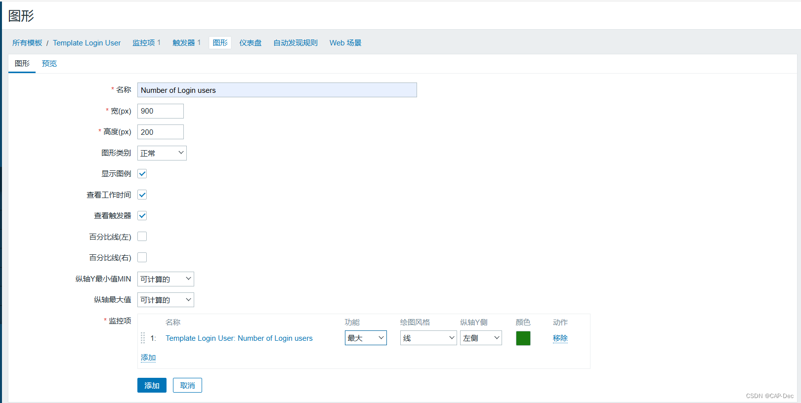 【监控项】点击添加勾选相关监控项 Number of login users,【功能】选择 最大,其它可保持默认值
