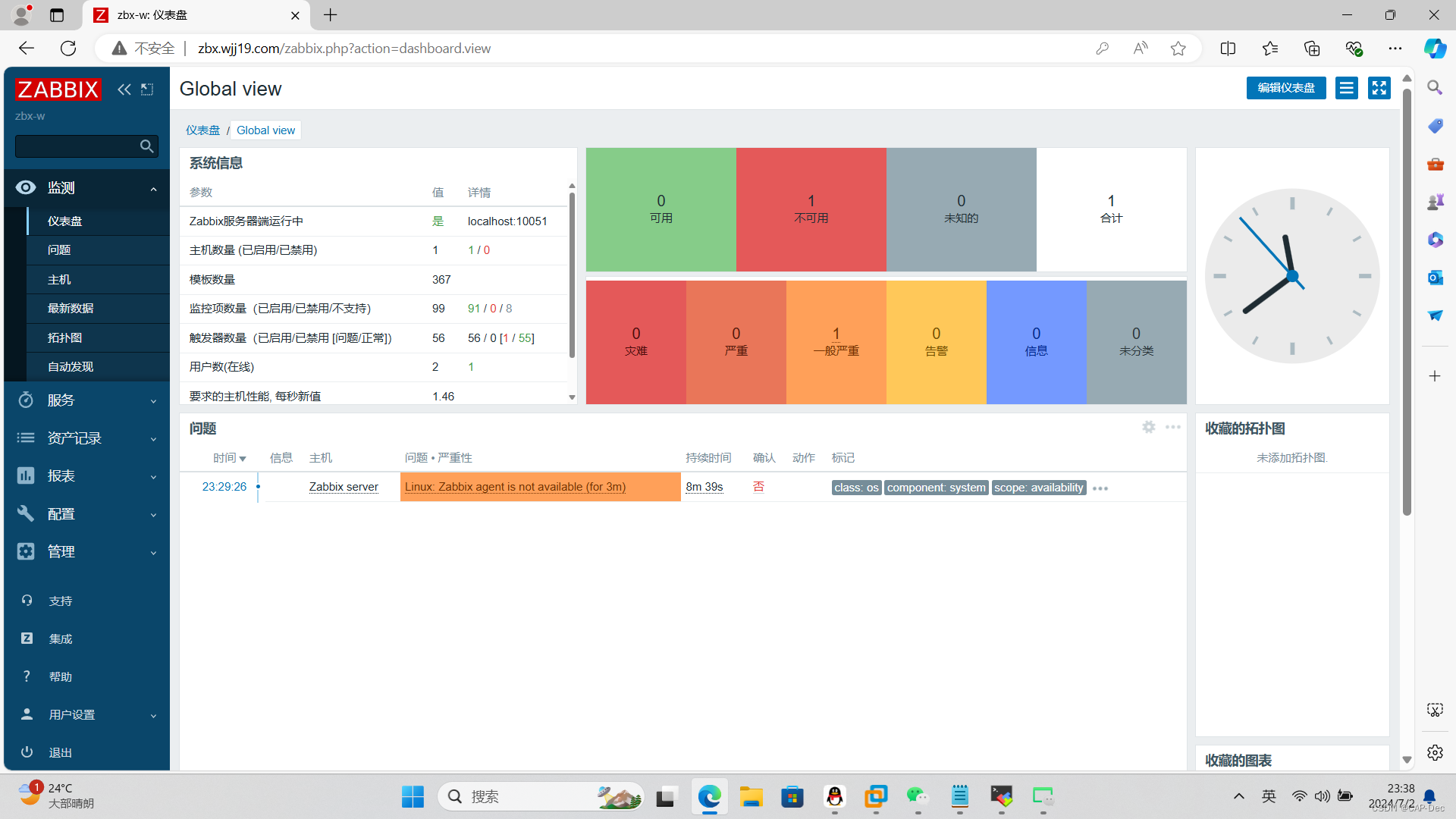 - zabbix agent 需要安装在被监视的目标服务器上,它主要完成对硬件信息或与操作系统有关的内存,CPU 等信息的收集。