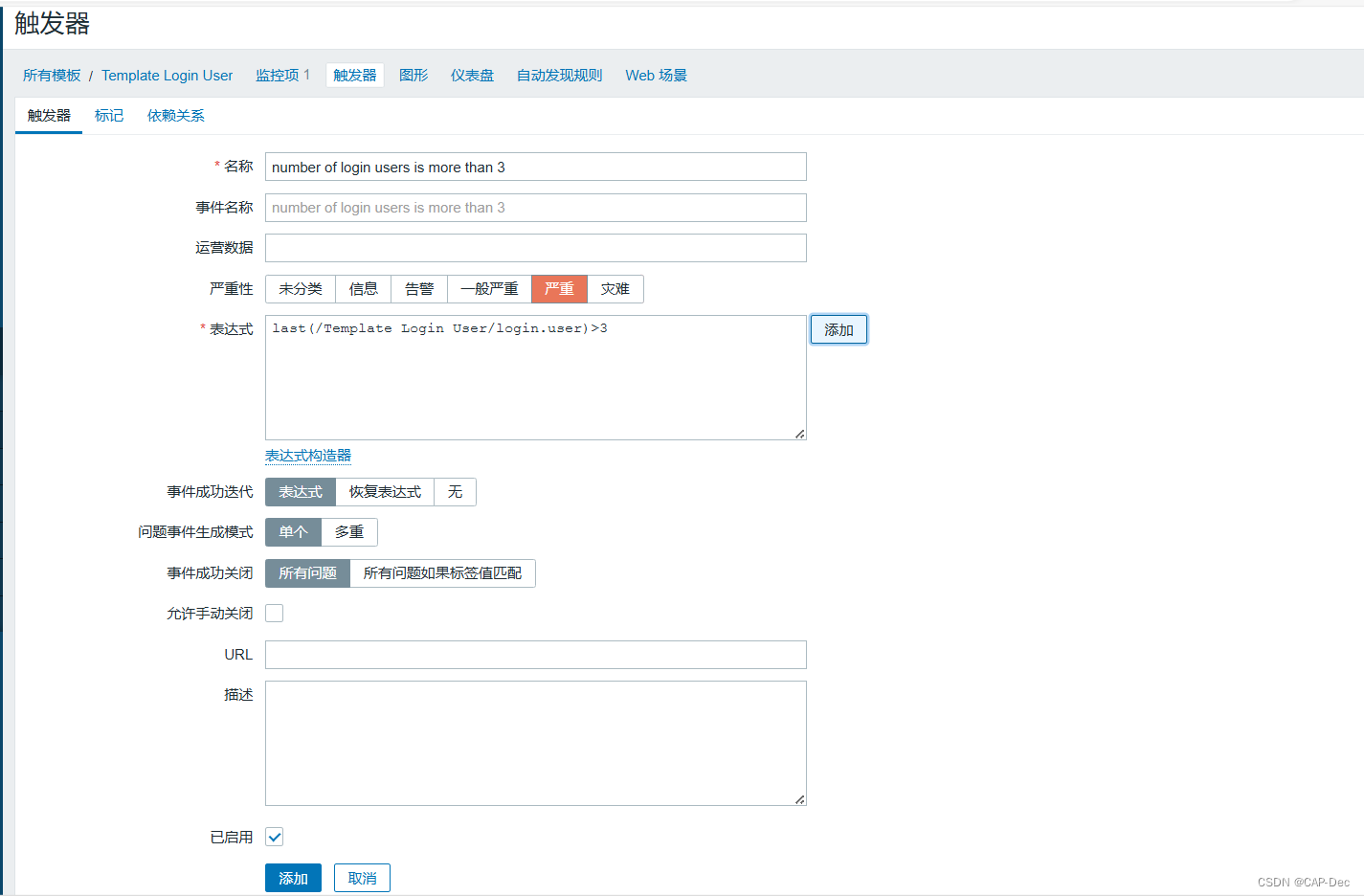 【表达式】点击添加,【监控项】点击选择 Number of login users,【功能】选择 last(),【结果】选择 > 3,点击 【插入】