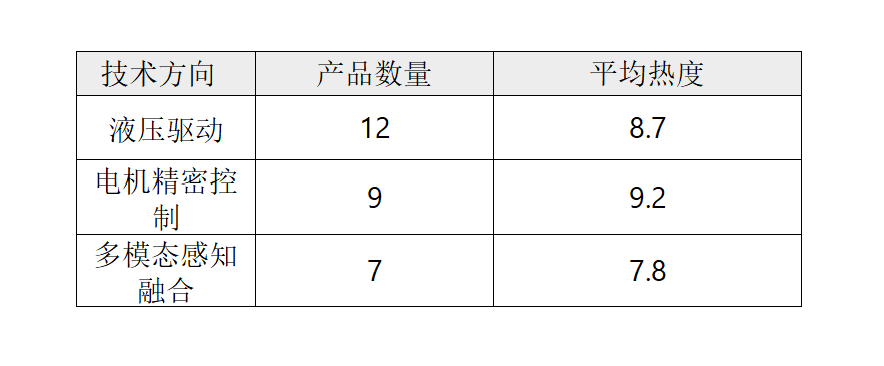 “对比优必选和宇树的核心技术,按技术方向统计产品数量,并显示热度趋势。”