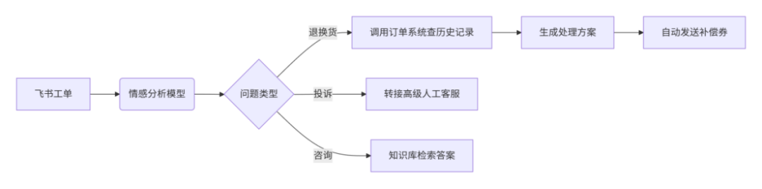 飞书工单→ 提取客户问题 → 调用CRM查历史订单 → 终端生成解决方案 → 邮件回复客户