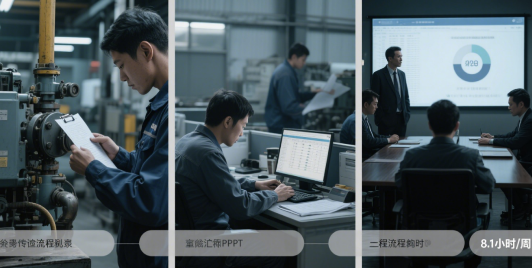 传统流程:工人纸质记录→ 文员录入Excel → 主管汇总PPT(耗时8小时/周)