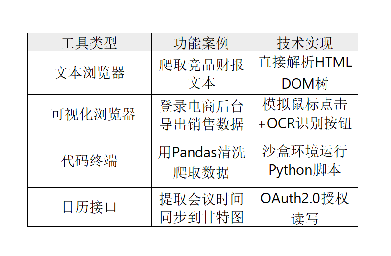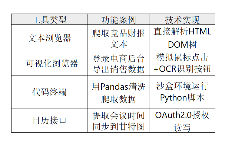 Multi-Component Protocol(多组件协议)统一调度异构工具链,例如通过文本浏览器提取网页信息(如竞品财报)、可视化浏览器模拟人工操作(如登录电商后台下单)、终端执行代码处理数据(如Python分析销售趋势)。实际案例:制作行业分析报告时,Agent自动调用文本浏览器爬取3家竞品官网数据→终端运行Pandas计算市占率→PPT插件生成图表,实现跨工具无缝协作。