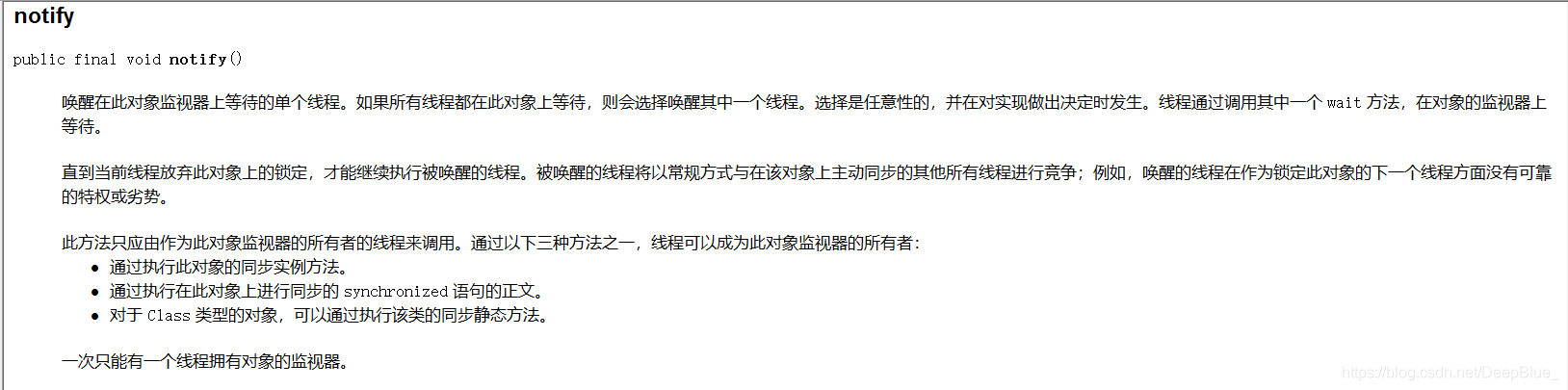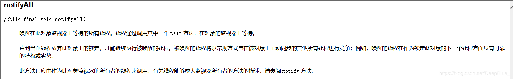 notify()调用后不会立即释放锁,而是当执行notify()的线程执行完成,即退出同步代码块才会释放掉锁。
