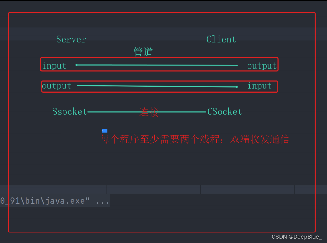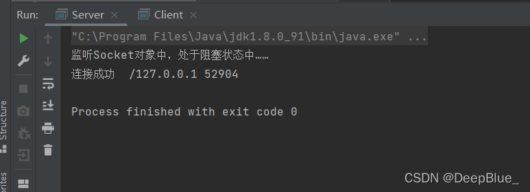 ServerSocket是去监听客户端的连接的,一开始这个管道是阻塞的,当有端口请求发送上来的时候就会去建立一个连接,拿到一个Socket对象。然后服务端拿到Socket对象之后,获取这个对象的输入输出流,我们就可以进行写入和读取数据。这一章我们先来建立连接直接通信。详细的发送消息放到后面。下面就是详细的代码,我就写了两个类,一个服务端,一个客户端。