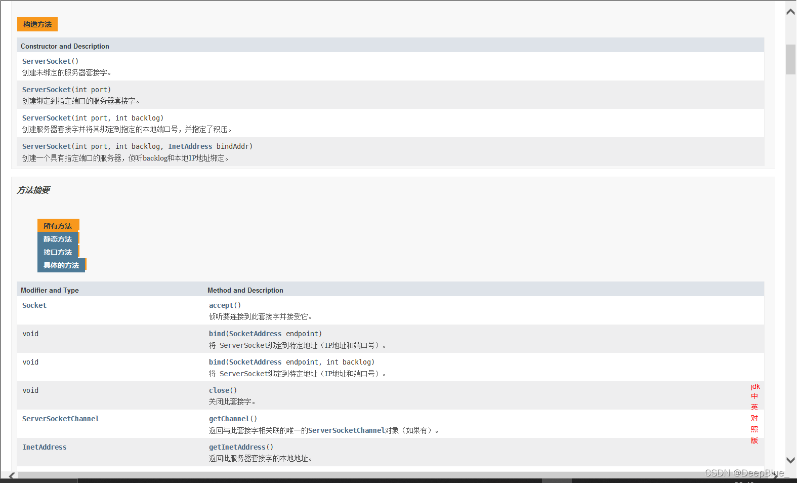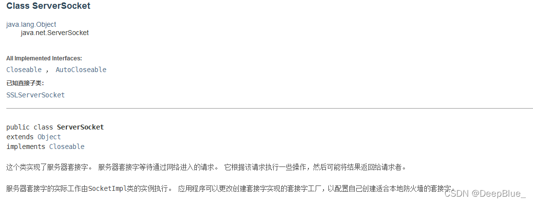 jdk1.8中的net包下会有一个ServerSocket类,我们可以去API文档中先查看下。