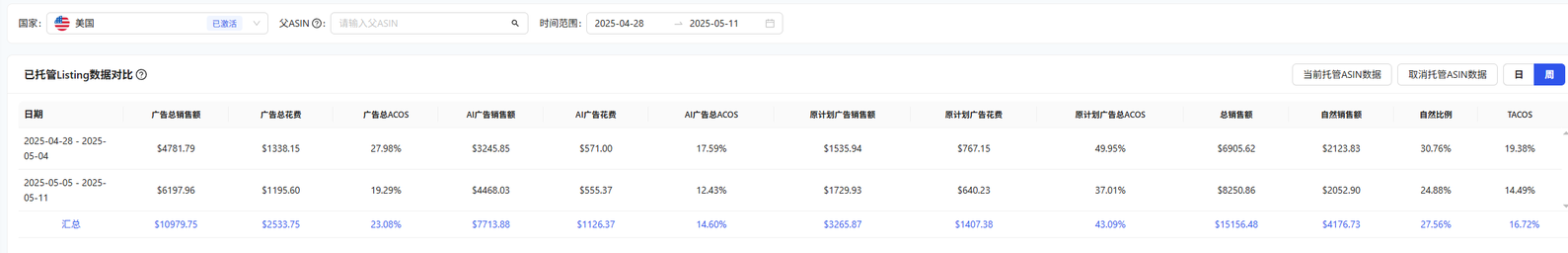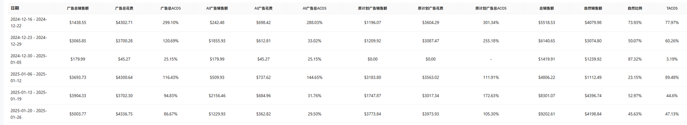 - 稳定期放量控本同步:到第 6 周,AI 投放花费仅为人工的 9%,却实现 近 1/3 的销售额,ACOS 仅为 29.5%,显著优于人工的 105.3%。