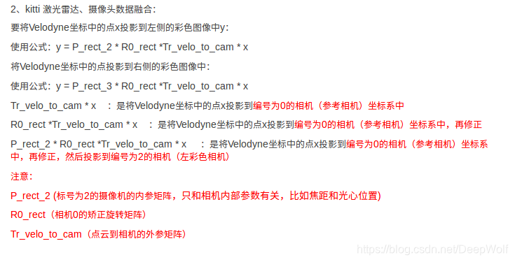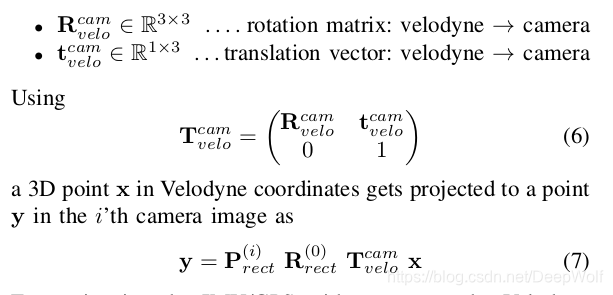 从Velodyne 坐标系到 相机坐标系的刚体变换存在于 calib_velo_to_cam.txt 文件中, 如下公式将 Velodyne 坐标系中的点投射到 第 i 个相机图片中.
