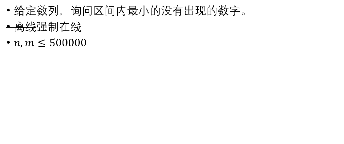 先考虑离线的时候怎么做,按右端点排序,线段树维护每个权值出现的最大位置和最大位置的最小值,然后在线段树上二分即可。在线直接考虑可持久化即可,时空复杂度n log n