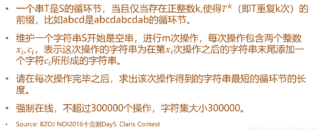 考虑如何优化kmp的往上跳过程,这里不能像在序列一样用“上一个与i不同后继的Border”来将跳的过程优化到log,因为这里是动态加点,形成了一棵树,如果Border已经<n/2那么就直接跳,否则我们可以证明周期p一定在跳fail的时候不断被跳(n/|p|)-1次。
