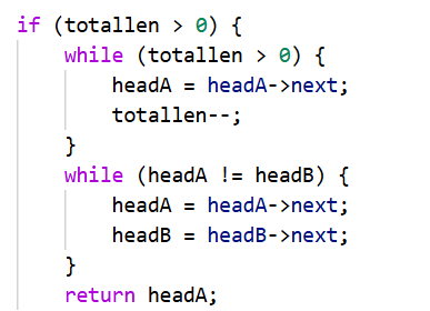 当totallen>0时,headA的长度大于headB;因此headA可以遍历totallen次,使两链表的总长度一致,再同时遍历链表,当headA等于headB时是交点。