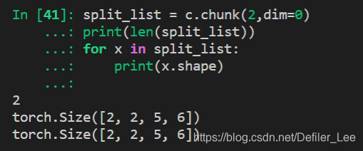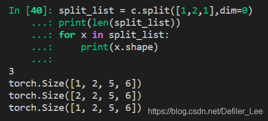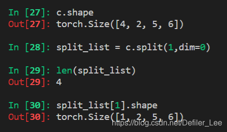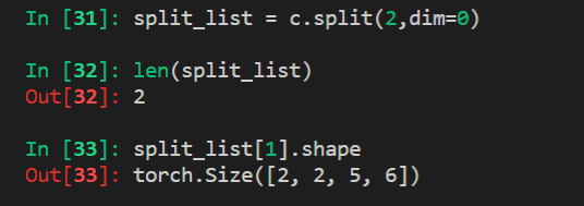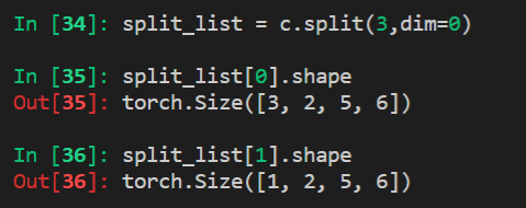 所以1,dim=0,表示将0维度,每一个进行切分,切出四个结果, 每个切分结果的维度都是[1,2,5,6]