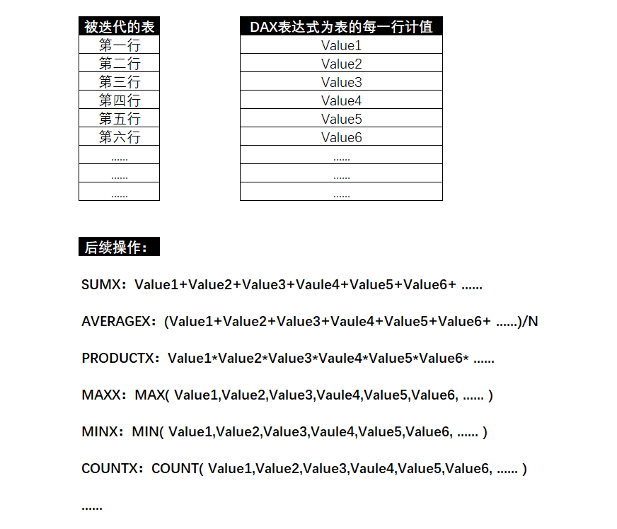 虽说DAX的迭代函数有许多,但是这些迭代函数的行为方式与语法结构都是差不多的,仅仅是在遍历完表后的后续操作有所不同。因此,迭代函数的行为可以总结为如下: