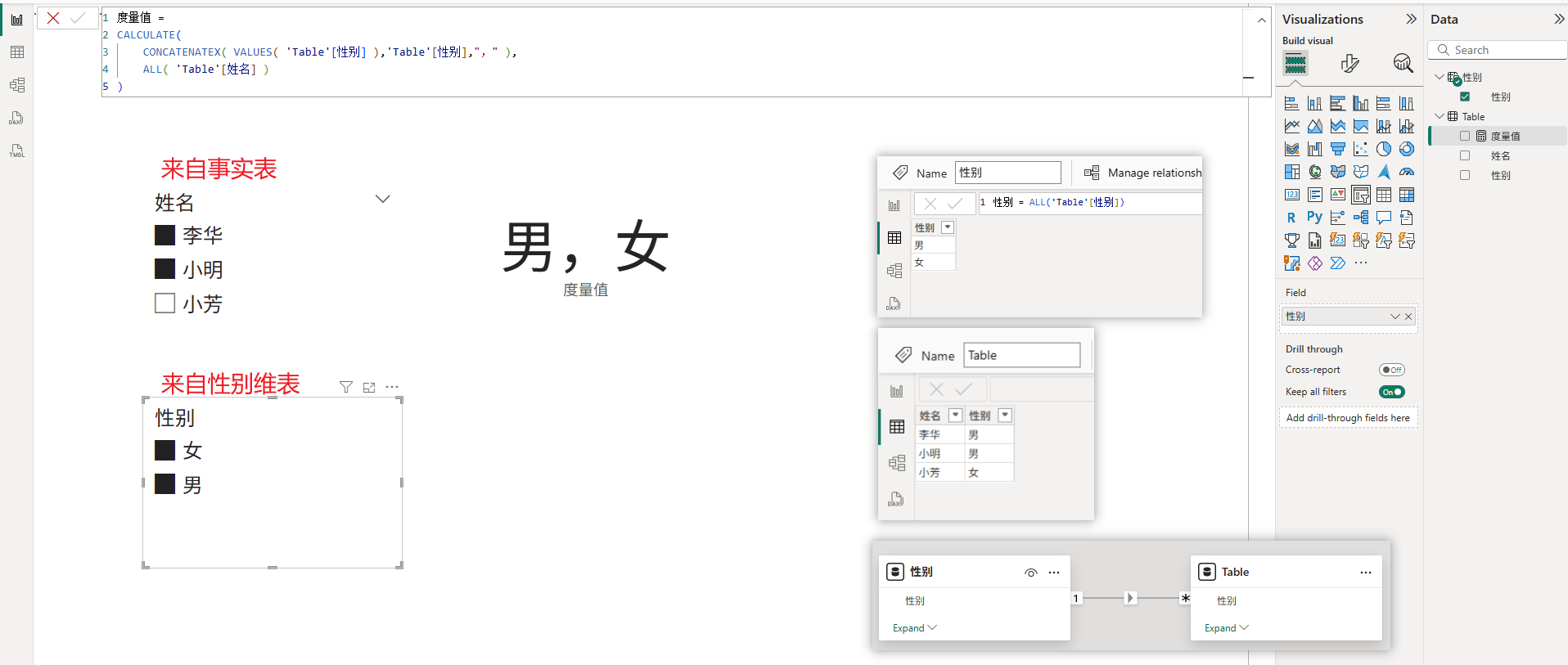 但如果提取一个性别的维度表,让姓名和性别筛选器分别来自不同的表,就不会触发Auto-Exists机制,从而使度量值返回最开始预期的男和女两个值。如下图所示: