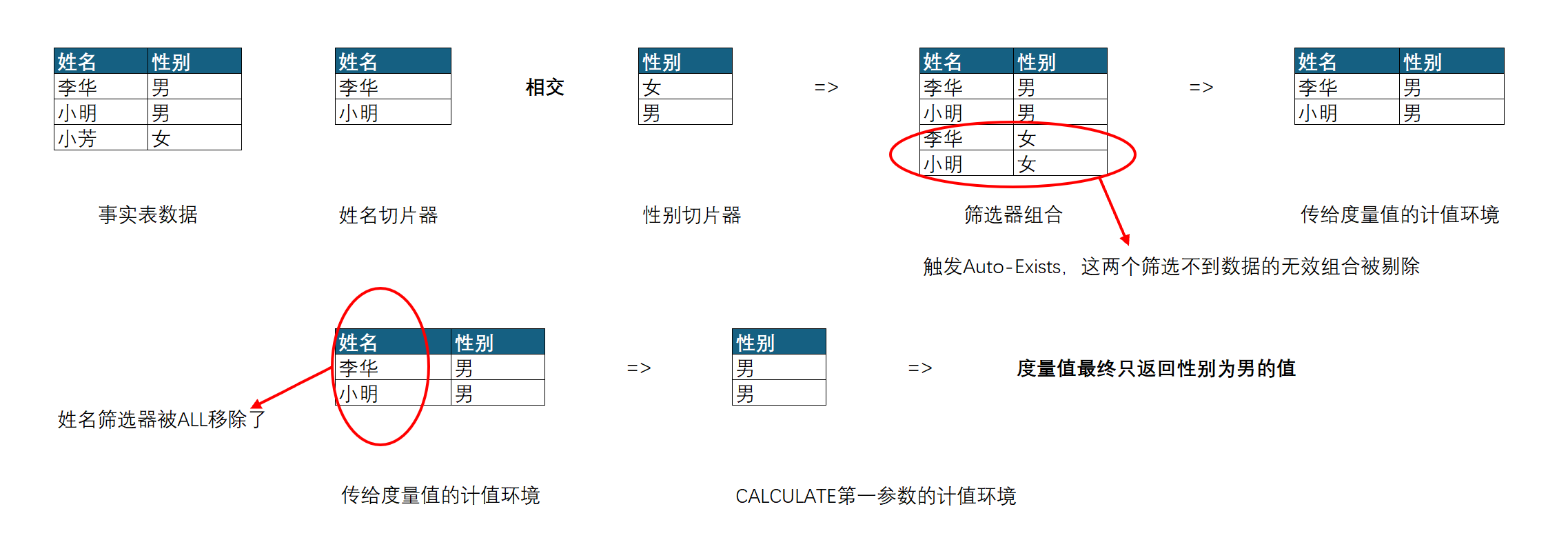 实际上,由于姓名筛选器和性别筛选器都是来自同一个表的,所以触发了Auto-Exists机制,那些筛选不到数据的无效筛选组合被自动剔除掉了,所以最终度量值只返回男,而不是返回男和女。具体计值流程如下图所示: