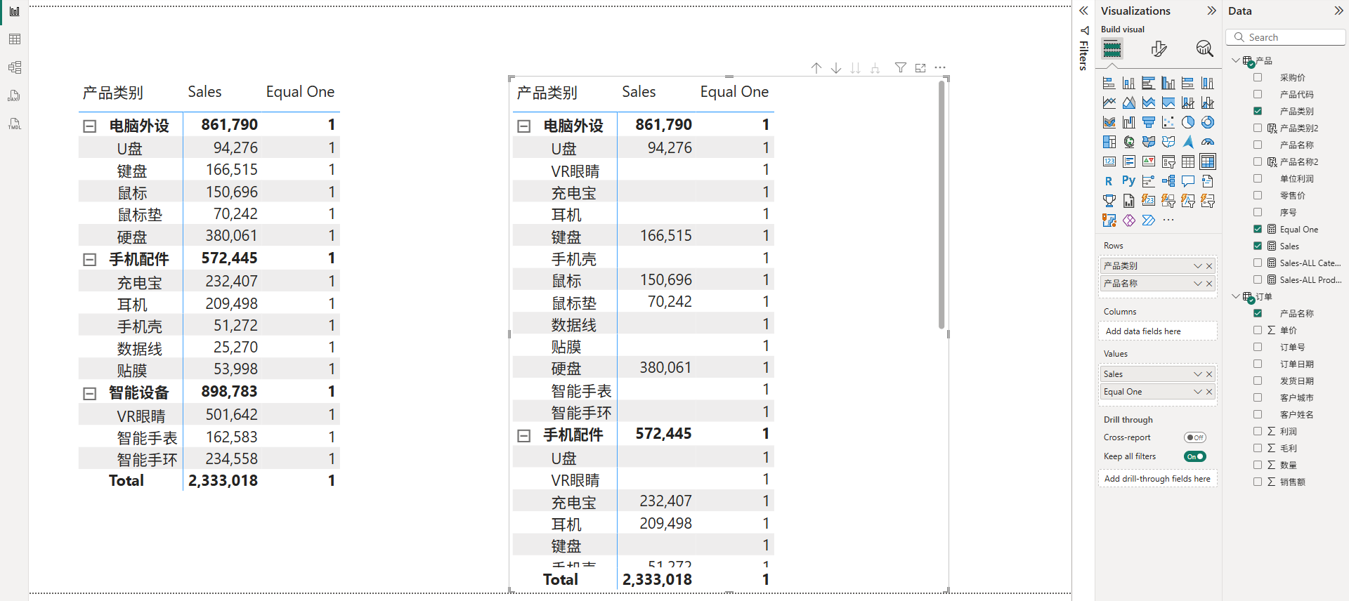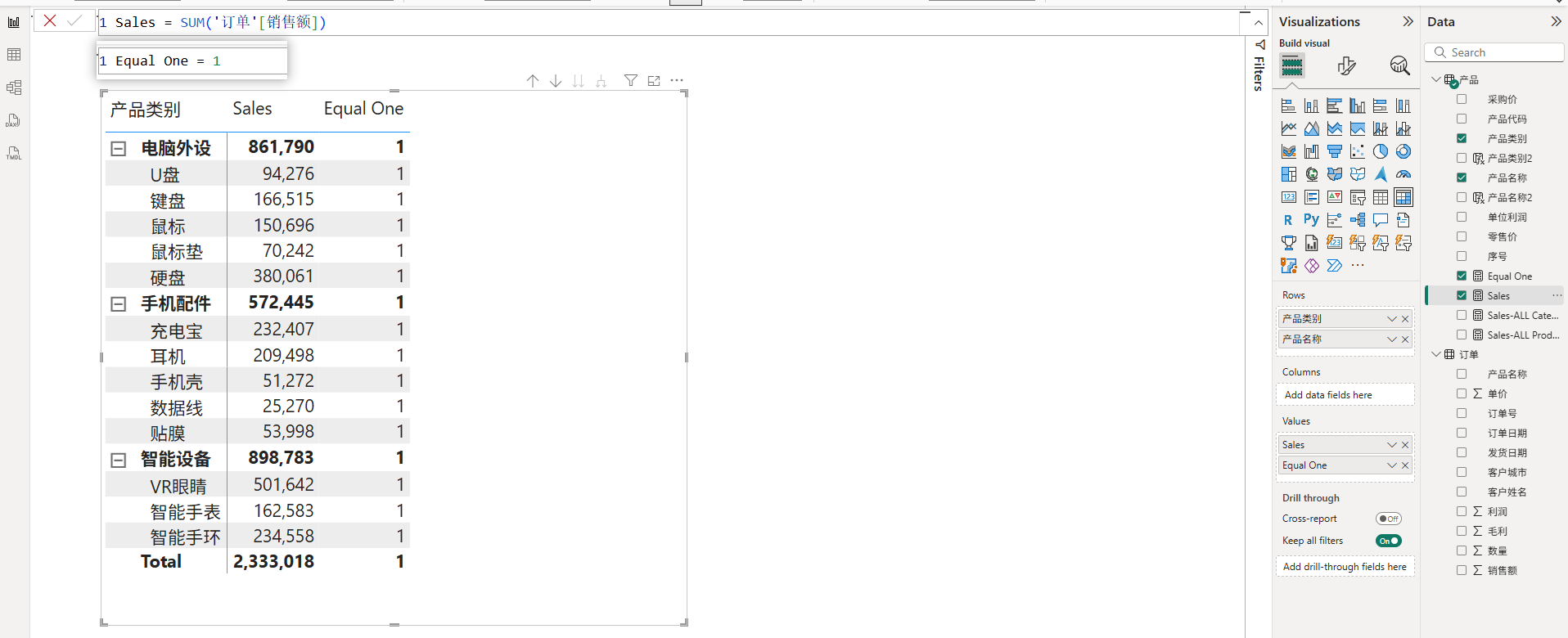 其中,恒等于一的度量值的作用是为了让矩阵的每一行都有值,从而显示出所有行列标签的组合。因为矩阵有个特性,即整行或整列的值都为空的行或列会被自动隐藏。所以添加一个恒等于一的度量值,可以用来区分目前显示的行标签是不是完整的。
