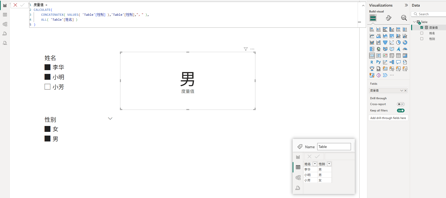 下面通过一个案例来辅助理解自动匹配的优化机制。如下图所示,模型中只有一个表,然后报表中存在两个切片器,分别筛选姓名和性别,然后度量值中先使用了ALL函数来移除姓名的筛选器,然后返回性别字段的可见数据,最终度量值只返回了性别为男的值。