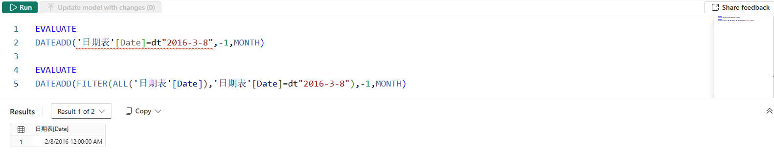 另外还需要注意下矩阵的小计与总计行,由于 DATEADD 函数不会返回重复日期,所以该案例的小计与总计行中,将只返回日期为2/28的单行单列的表,而单行单列的表可以当作标量值使用,因此小计与总计行中不会报错。