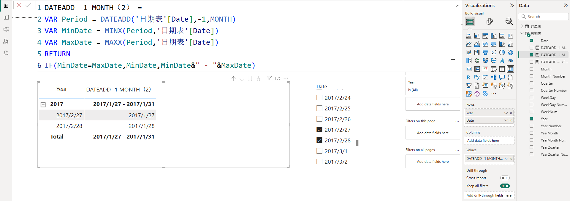 在矩阵明细行中,单个日期的平移并没有问题。但在小计与总计行中,可见日期包含2/27与2/28两天,虽然理论上平移后的日期应该是1/27与1/28这两天,但由于2/28还是二月份的最后一天,所以会触发跨临界日期规则,导致返回的结果持续到了平移月份的月底,即返回:1/27至1/31。