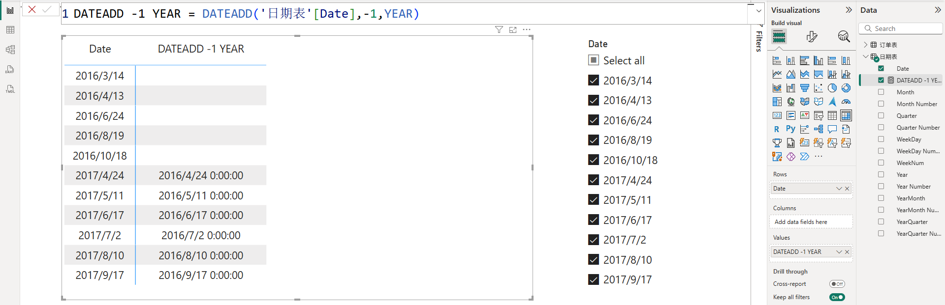 由于案例文件中的日期表的范围是从2016年1月1日至2017年12月31日,因此向过去平移一年时,2016年的日期理论上应该返回2015年的对应日期,但由于日期表中不存在2015年的日期,所以只能返回空。