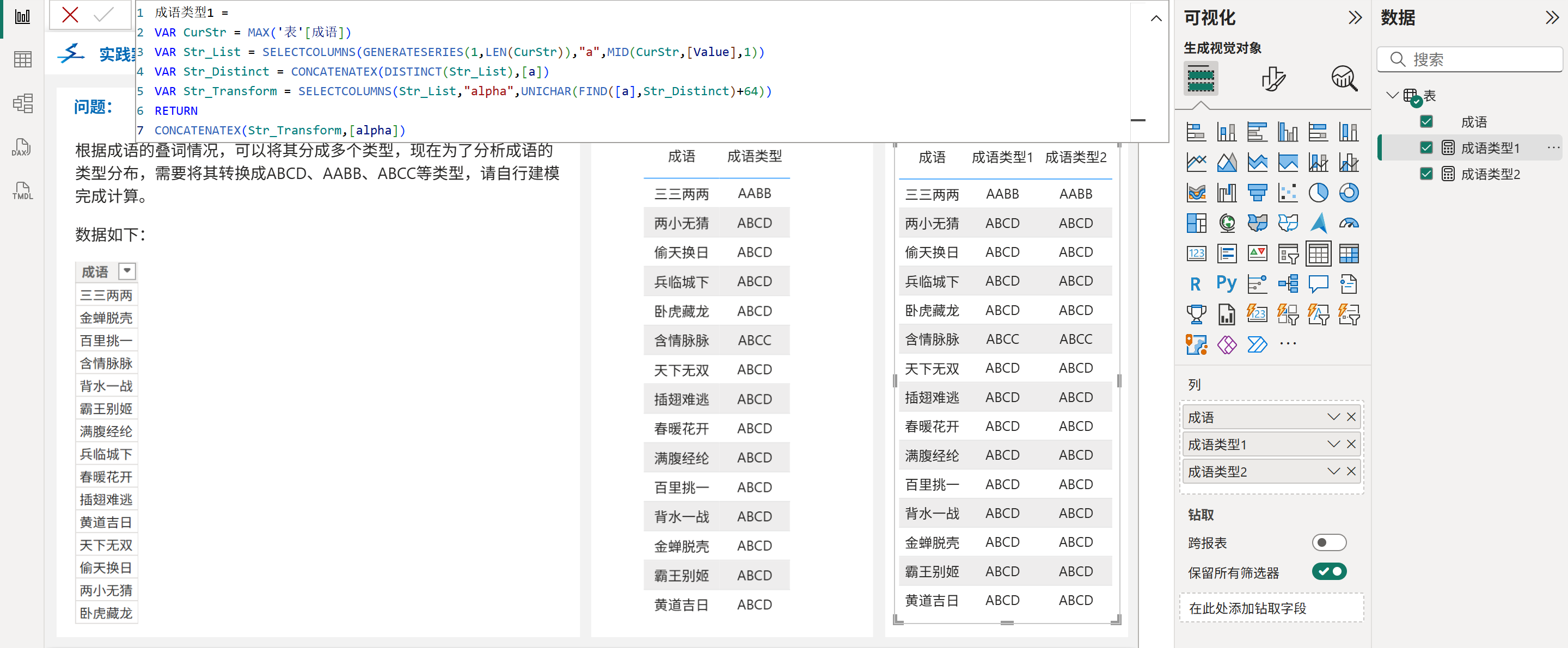 成语作为汉语的精华,蕴含着丰富的文化内涵和语言智慧。对成语进行分类分析不仅有助于语言学习,也能展示PowerBI在文本数据处理方面的强大能力。本篇文章将介绍如何在PowerBI中实现成语类型转换。