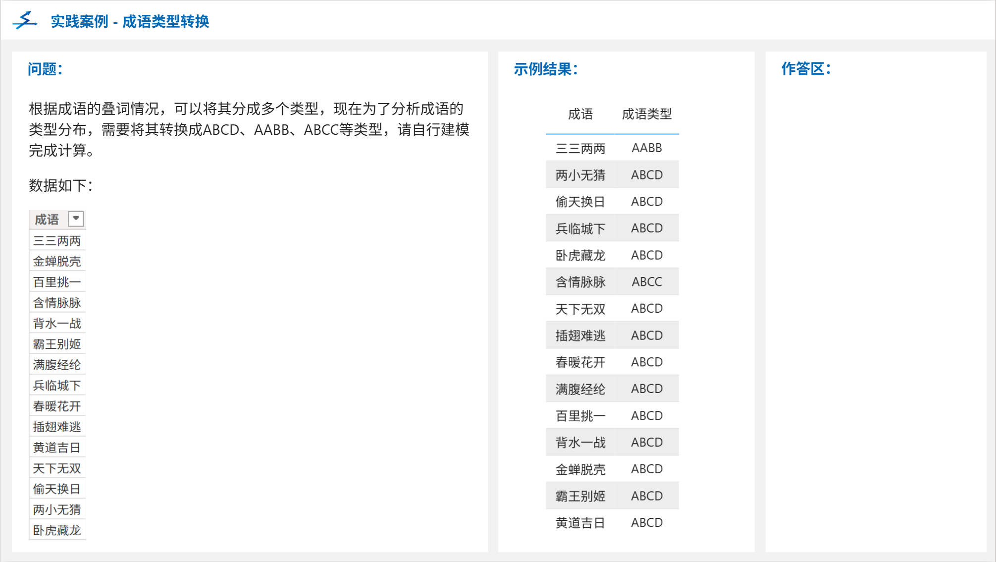 根据成语的叠词情况,可以将其分成多个类型,现在为了分析成语的类型分布,需要将其转换成ABCD、AABB、ABCC等类型,请自行建模完成计算。