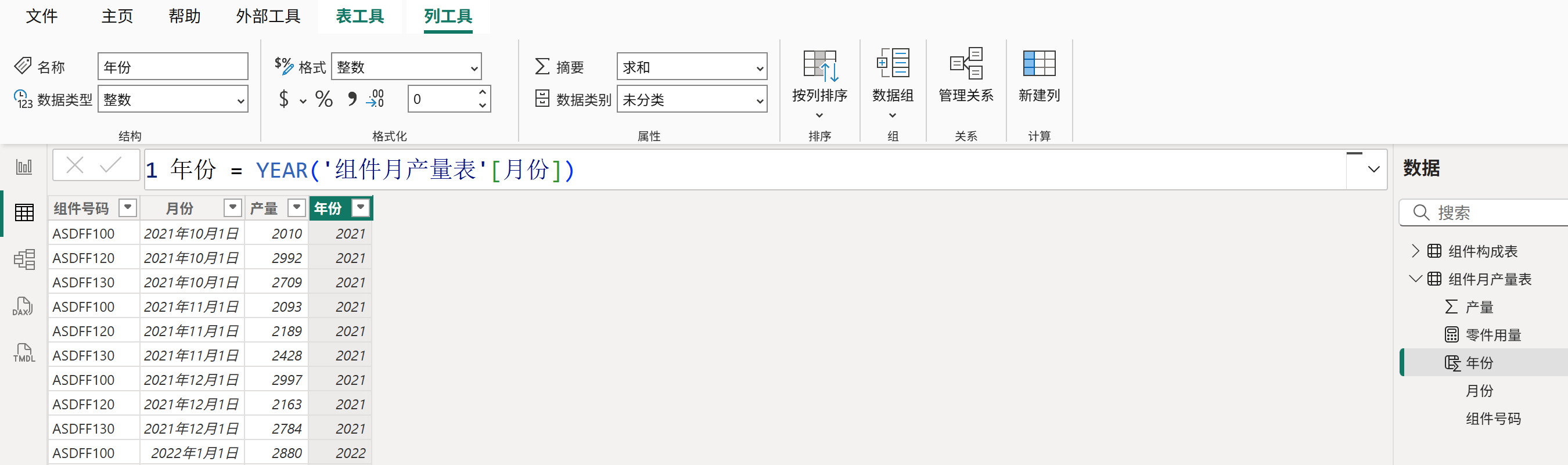 然后,在组件月产量表中添加一个年份计算列,如下图所示: