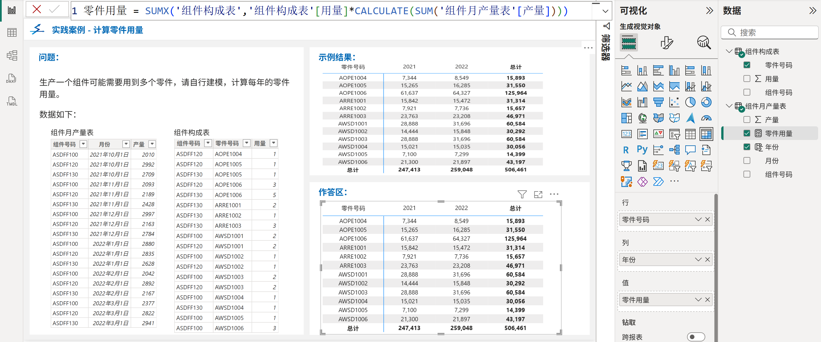 零件用量 = SUMX('组件构成表','组件构成表'[用量]*CALCULATE(SUM('组件月产量表'[产量])))