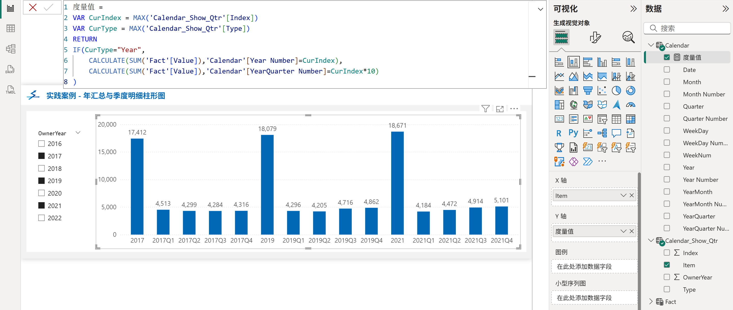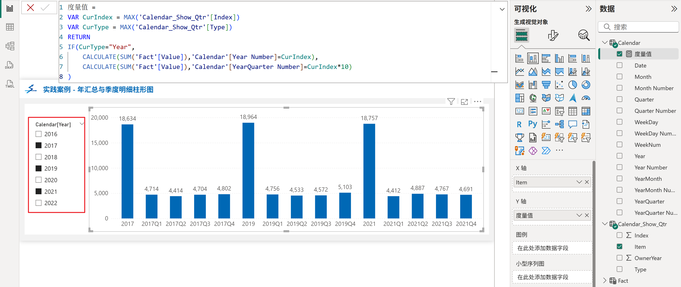 由于需要在柱形图的单个X轴字段中同时展示年份与季度,因此必须先构造一个包含所有年份和季度的字段来作为辅助表,然后剩下的常规套路就是使用度量值来控制哪些柱子应该展示。