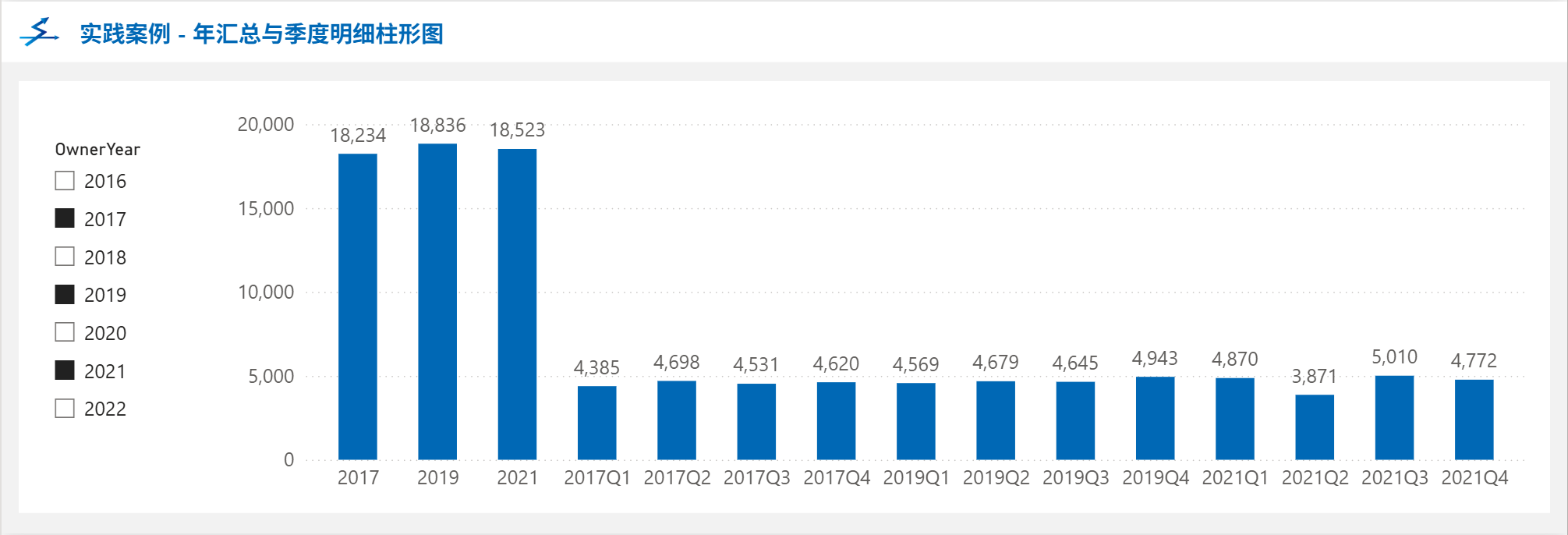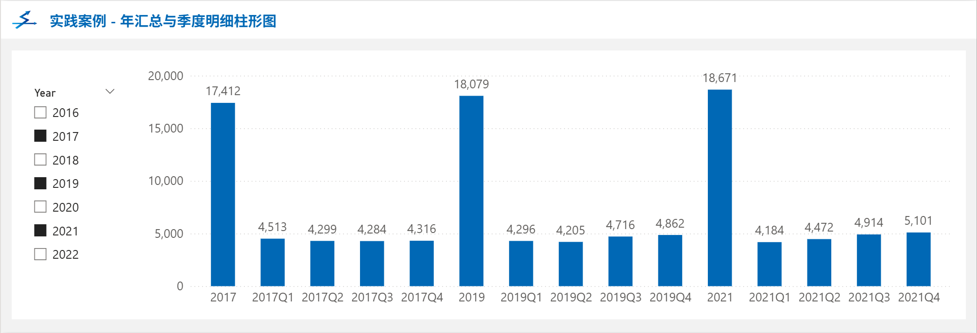 本篇文章将介绍如何在PowerBI中绘制这种同时展示所选年份的年汇总与季度明细的柱形图。