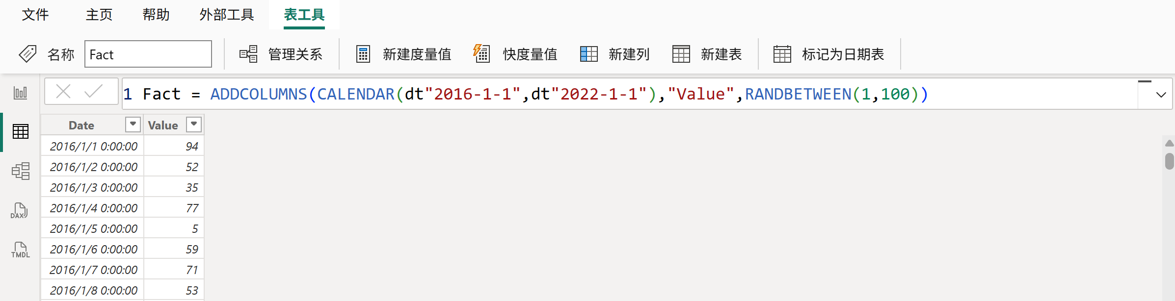 Fact = ADDCOLUMNS(CALENDAR(dt"2016-1-1",dt"2022-1-1"),"Value",RANDBETWEEN(1,100))