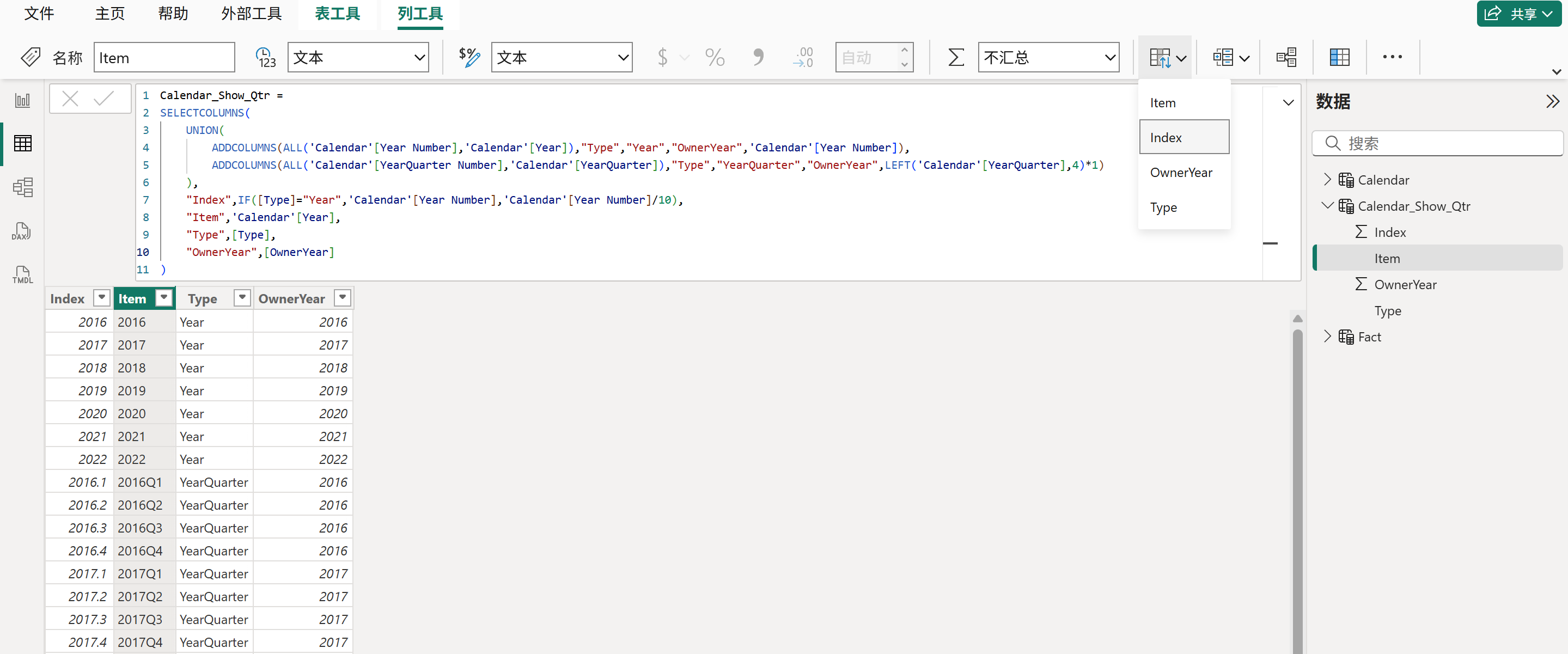 最后,还需要以正确的顺序来显示年份与季度,因此还需要给辅助表再加一个排序字段,以便设置按列排序。