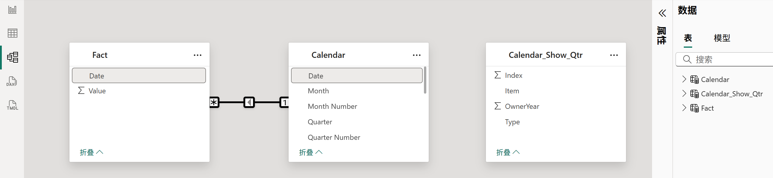 然后将日期表与事实表连接关系,辅助表则不需要连接任何关系,最终的模型关系如下图所示: