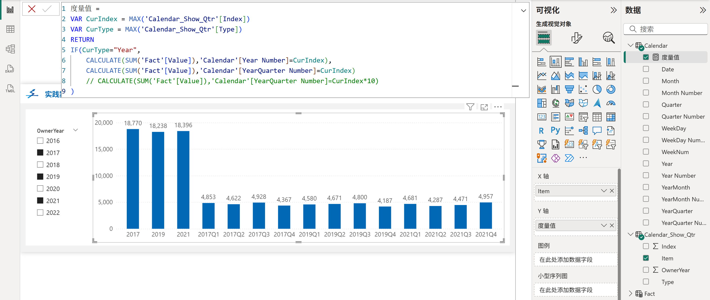 另外,由于度量值里的条件判断与筛选器转移等均是使用的年份或季度的索引字段,因此前端的年份与季度等字段的展示格式可以随意变化,并不会造成影响。