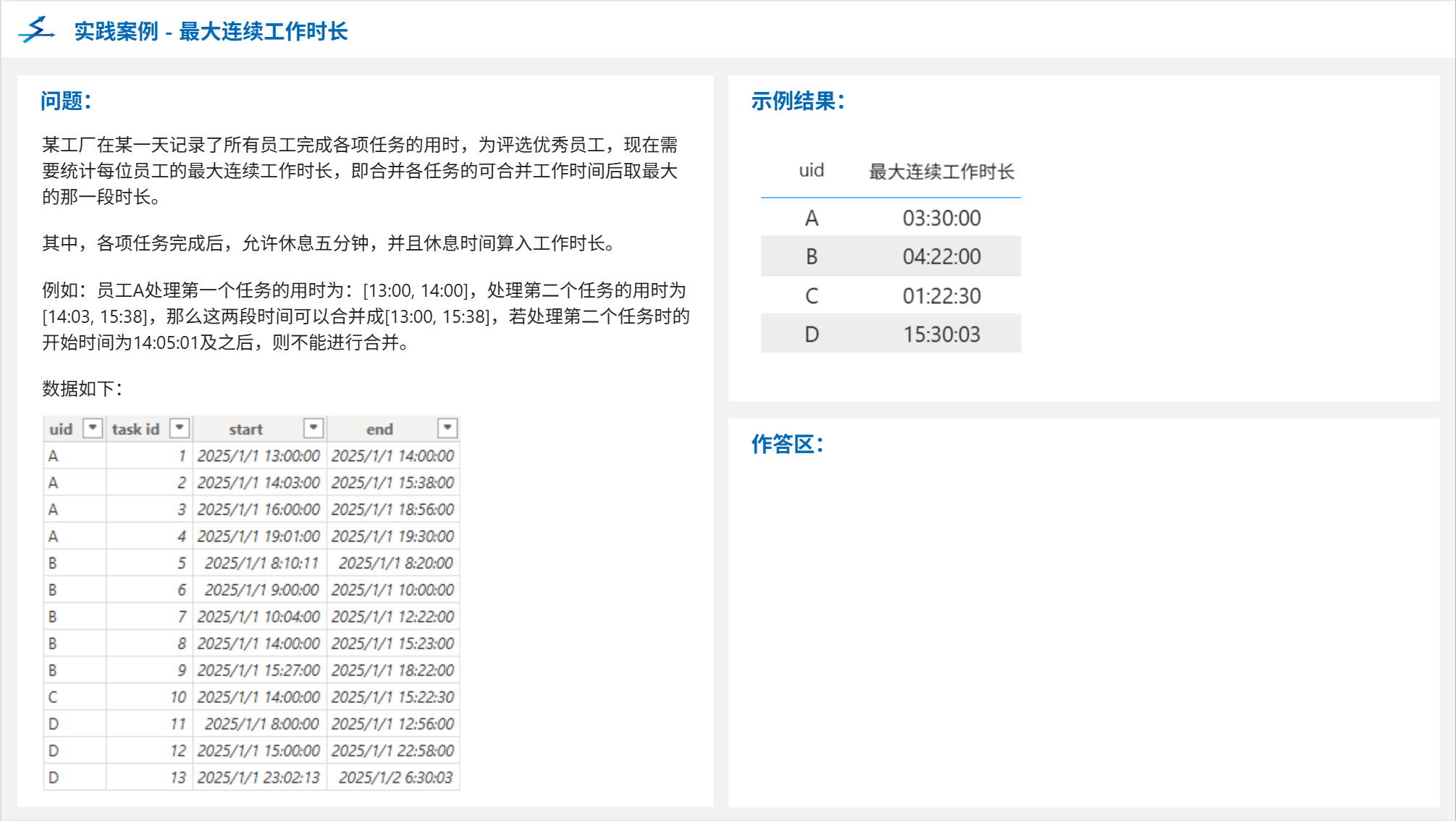 首先,需要计算出员工所对应的所有连续工作时间段,然后取时间最长的即可。连续工作时间段的计算思路如下: