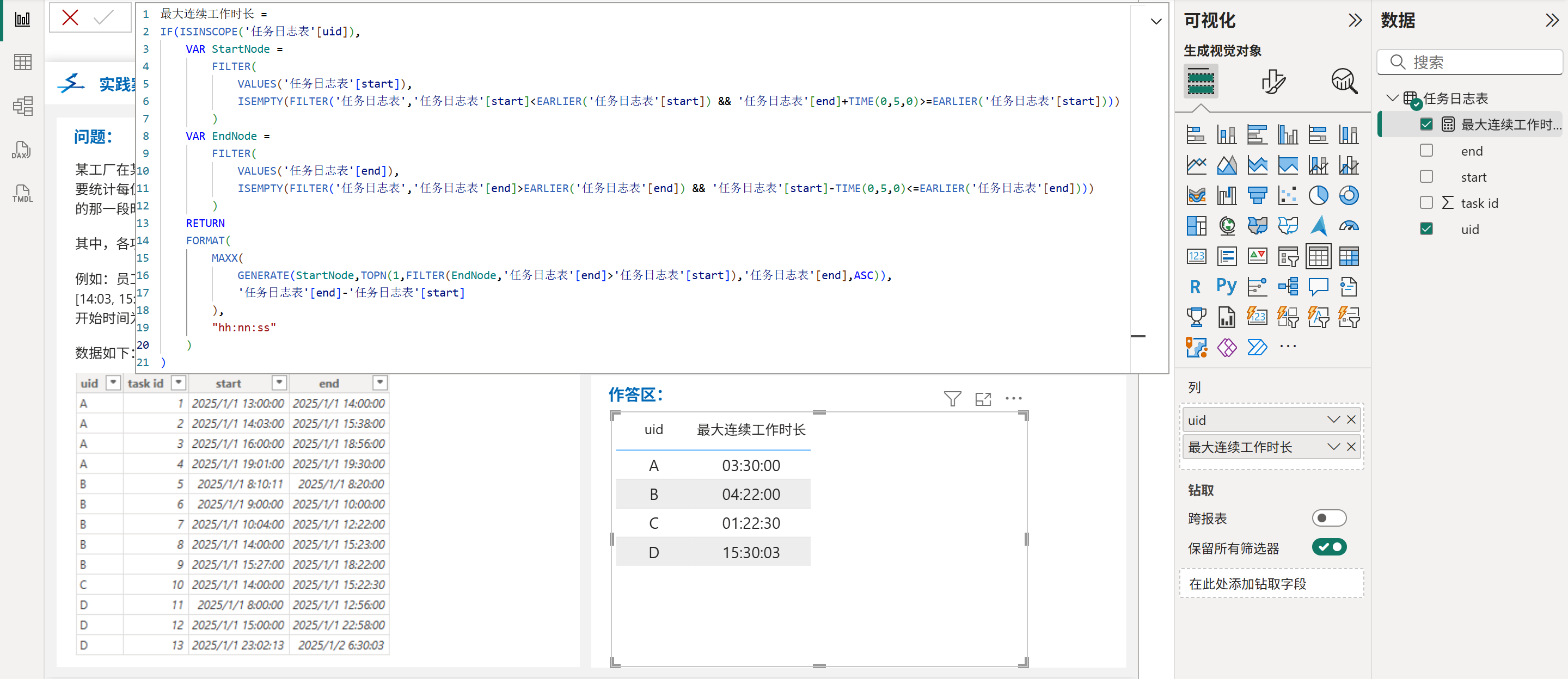 在人力资源管理和员工考勤分析中,计算最大连续工作时长是一个常见但具有挑战性的需求。这个指标不仅能帮助企业了解员工的工作模式,还能用于合规性检查、工作效率评估以及异常行为检测。本篇文章将介绍如何在PowerBI中实现这一指标的计算。
