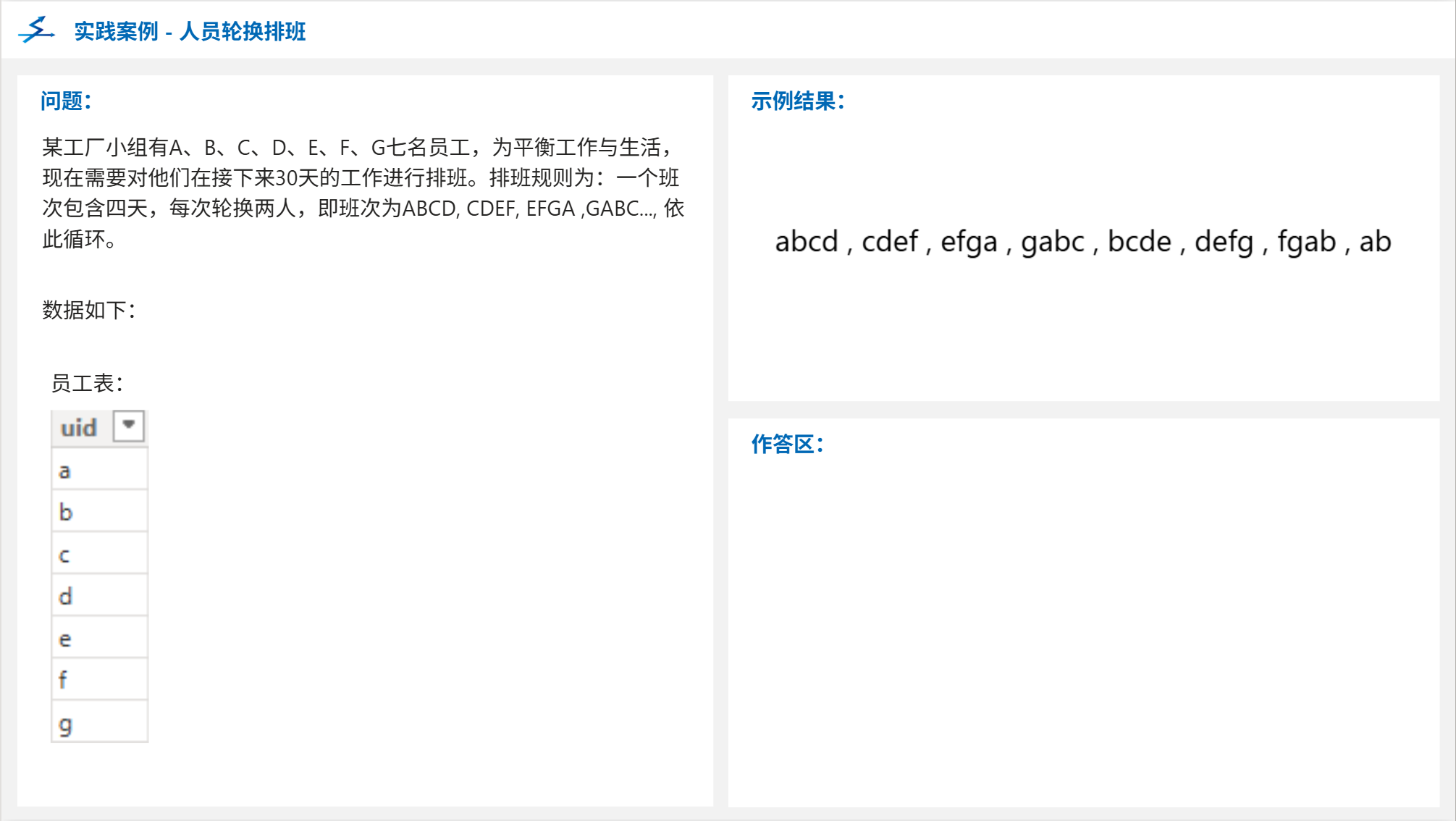 可以使用GENERATE函数与GENERATESERIES函数来对员工表进行复制追加,然后迭代每个班次的开头位置并使用窗口函数进行定位及取值,最后进行文本拼接与字符长度控制即可。