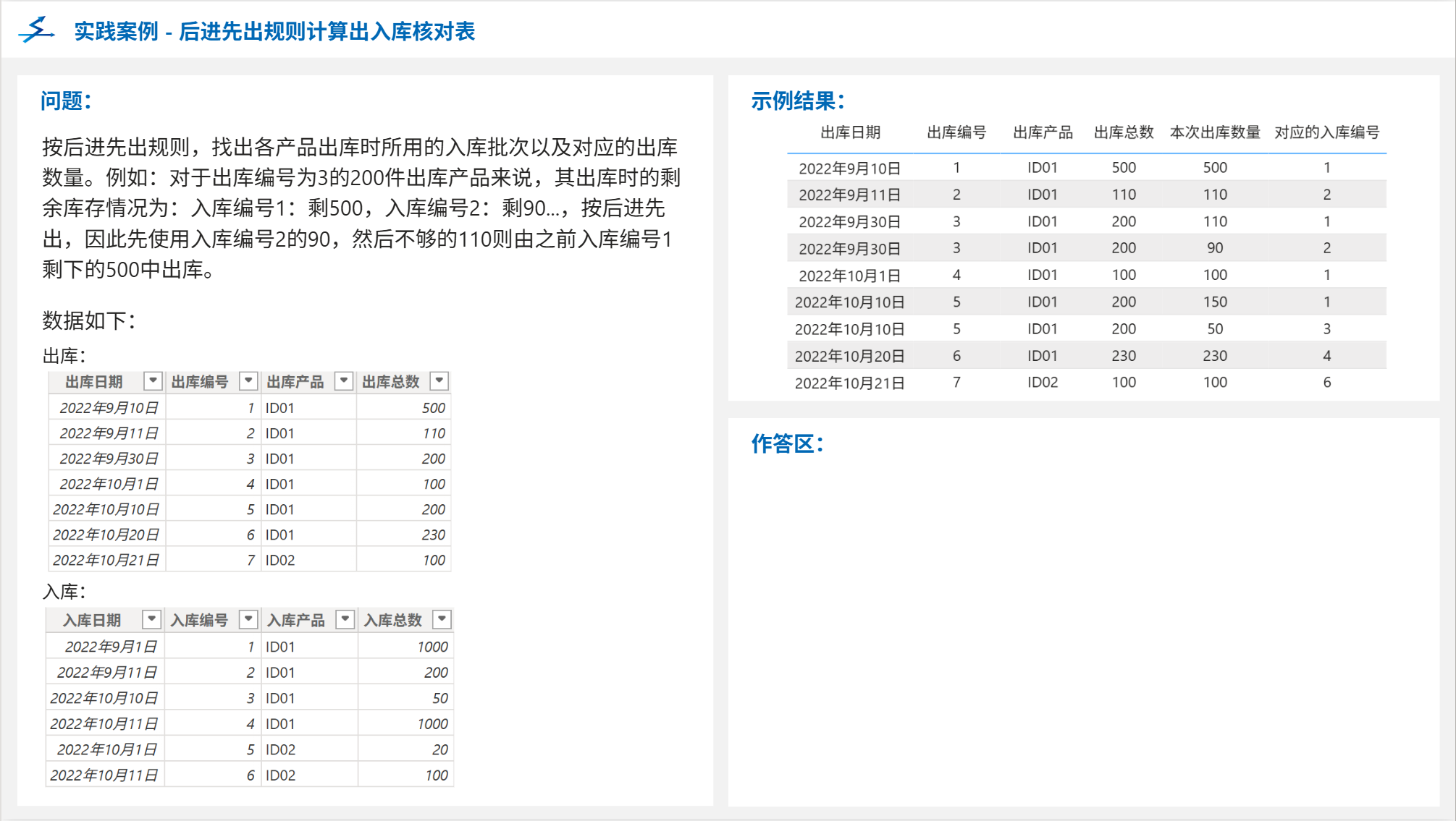 在本案例中需要注意的是,查找某个产品出库时所用的入库批次以及对应的出库数量时,必须要考虑到在前面出库的产品对库存的影响,否则计算结果将不正确,而这也是本案例的难点。