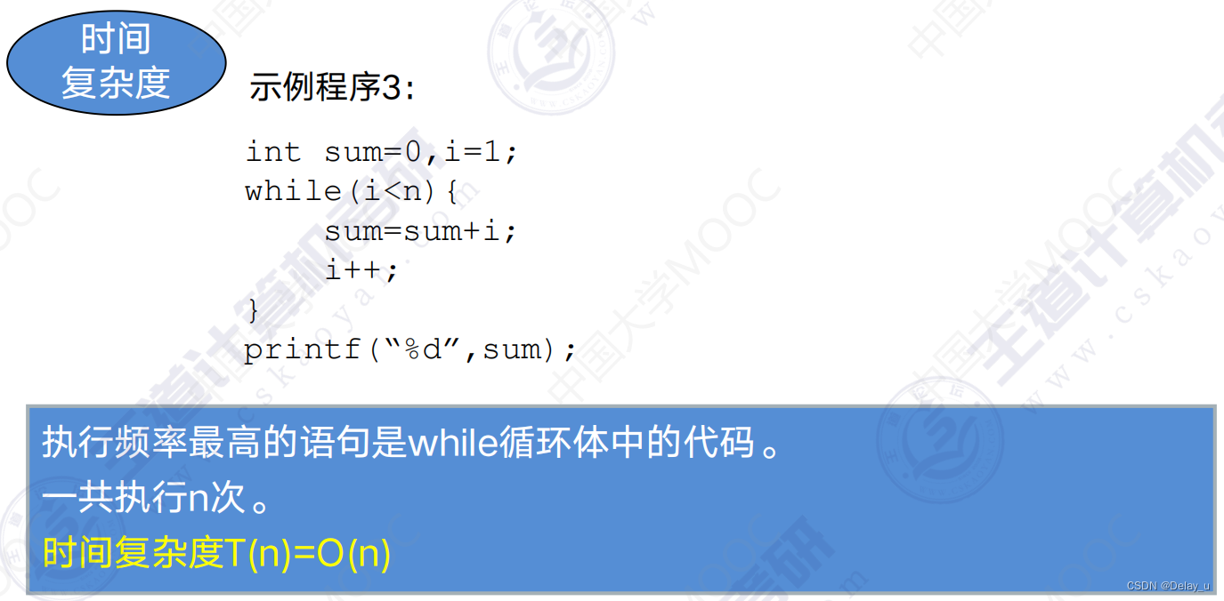 时间复杂度指算法中所有语句的频度(执行次数)之和。 记为: T(n)=O(f(n))