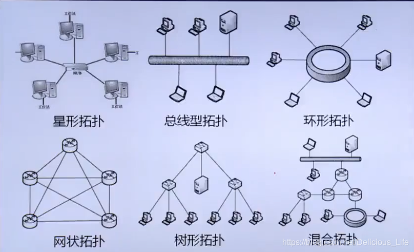 星形、总线型、环形、网状、树形、混合拓扑结构