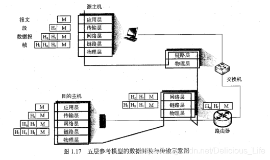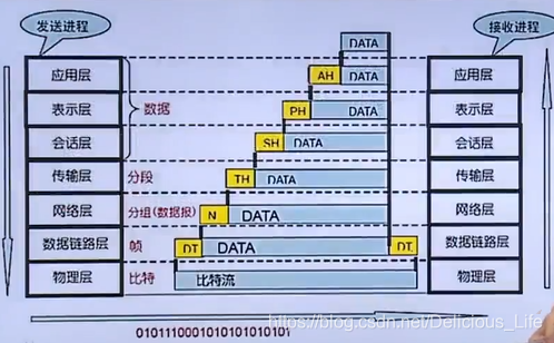 物理层传输比特,链路层传输帧,网络层传输数据报,传输层传递段,应用层传输报文