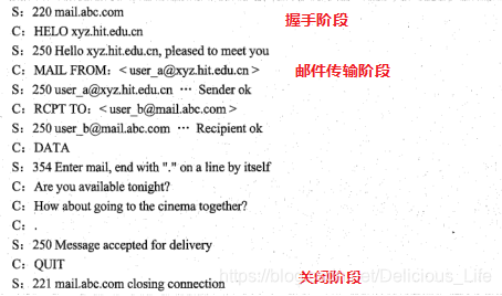 SMTP是Interneet电子邮件中核心应用层协议,实现邮件服务器之间或用户代理到邮件服务器之间的邮件传输。SMTP使用传输层TCP实现可靠数据传输,端口号是25,。SMTP通过3个阶段的应用层交互完成邮件的传输,分别是握手阶段,邮件传输,关闭阶段。
