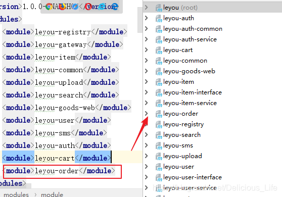 当你导入成功后,左侧栏会新增order模块,但是这里面的maven配置是有问题的,如图。