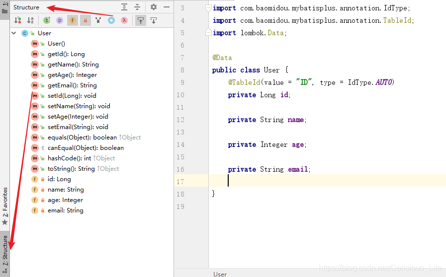 可以看到,Structure会显示使用lombok生成后的文件结构,但是如果我们不添加插件,虽然也生成了,但是可视化界面不会展示给我们。
