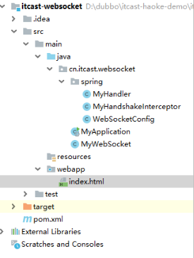 之后我们会把服务器端websocket的信息写在java包中,我们把客户端浏览器的请求信息写在webapp包中