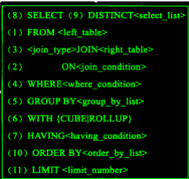 MySQL 的语句一共分为 11 步,如下图所标注的那样,最先执行的总是 FROM 操作,最后执行的是 LIMIT 操作。其中每一个操作都会产生一张虚拟的表,这个虚拟的表作为一个处理的输入,只是这些虚拟的表对用户来说是透明的,但是只有最后一个虚拟的表才会被作为结果返回。如果没有在语句中指定某一个子句,那么将会跳过相应的步骤