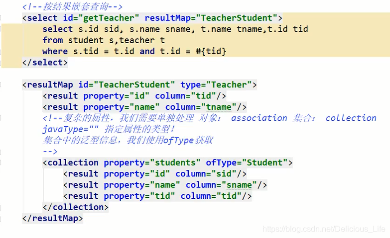 <select id="getStudent" resultMap="StudentTeacher">